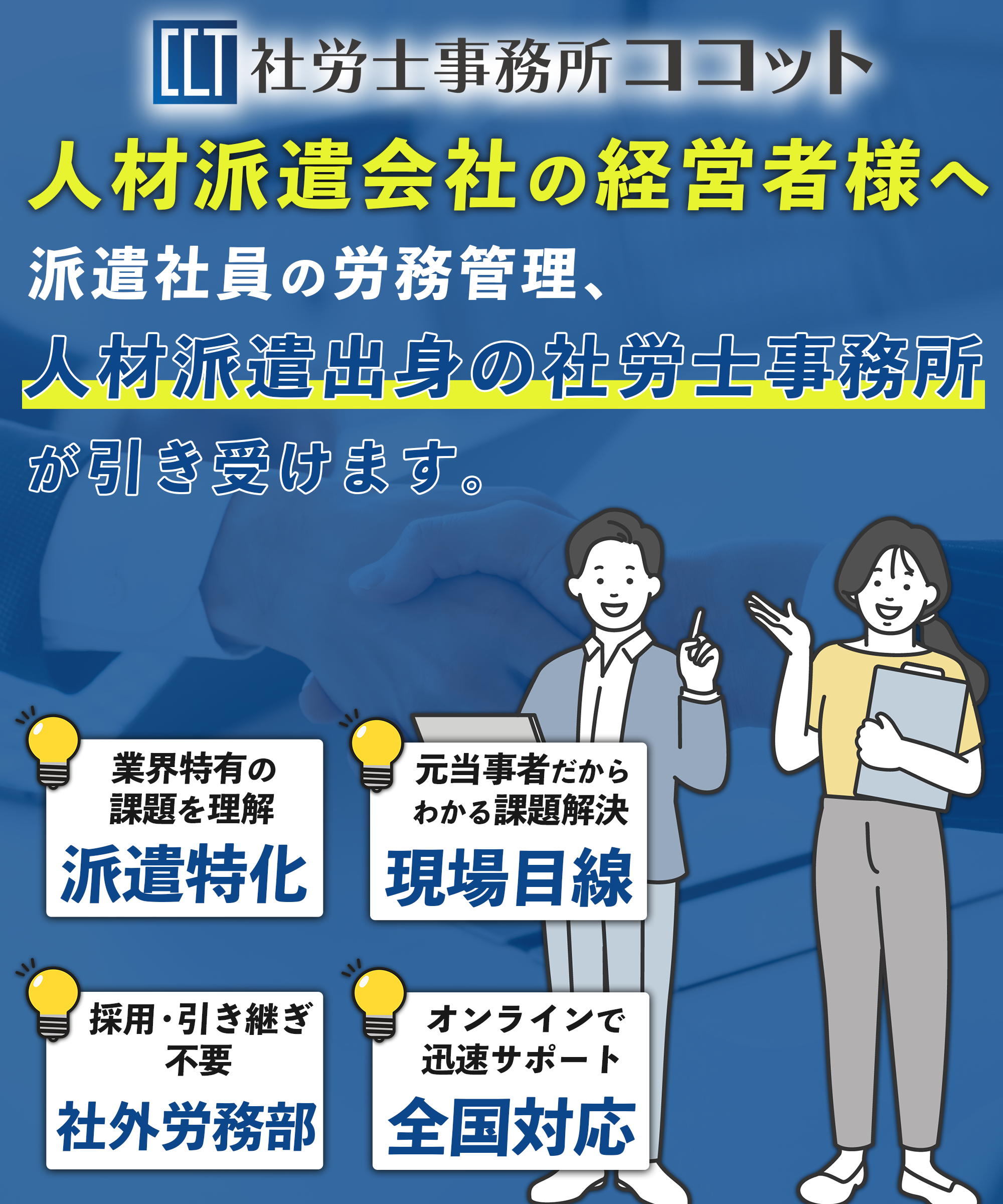 多くの派遣スタッフを抱える事業の特性上、専任の労務担当者の設置は不可欠です。しかし担当者の設置には採用難や急な離職による業務停滞のリスクが常に伴います。