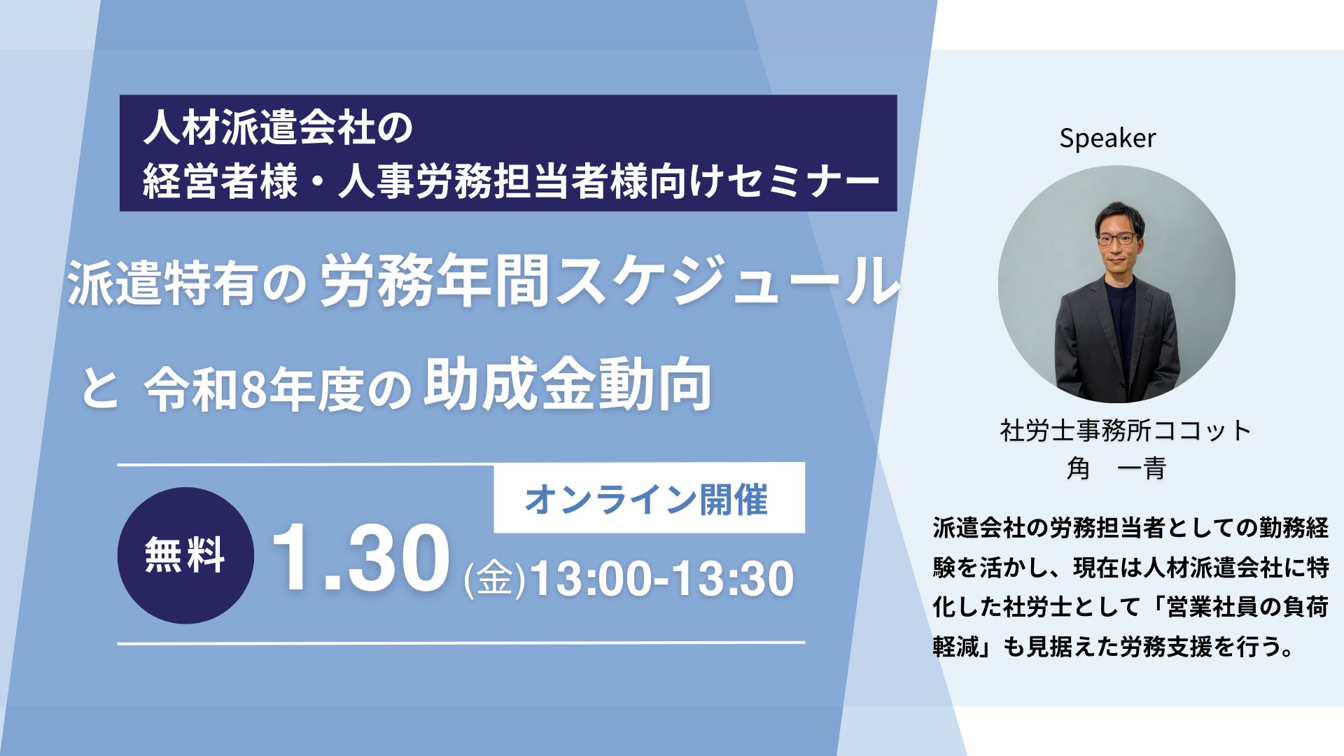 本セミナーでは、来年度の管理体制構築へ向けて、派遣業特有の「労務年間スケジュール」を時系列で整理し、各月で押さえるべき現場実務のポイントを再確認します。また、最新の予算概算要求から読み解く「令和8年度・助成金」の動向についても、30分に凝縮して解説いたします。